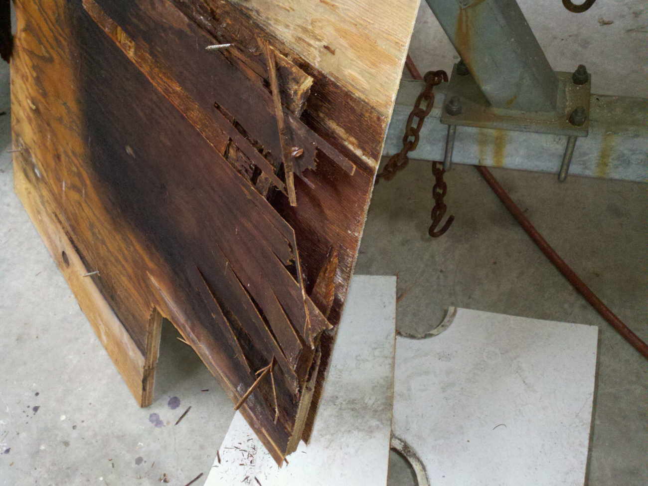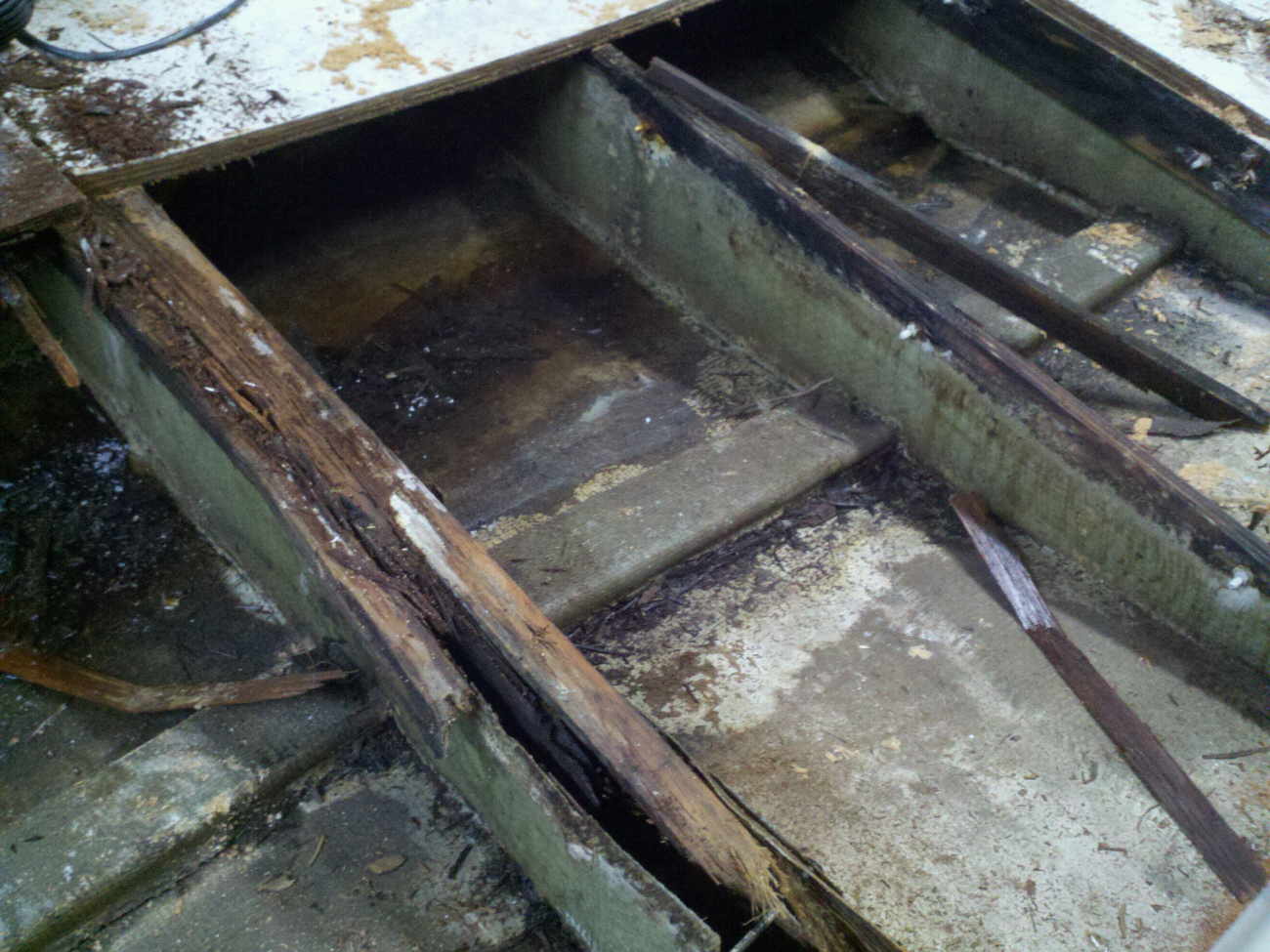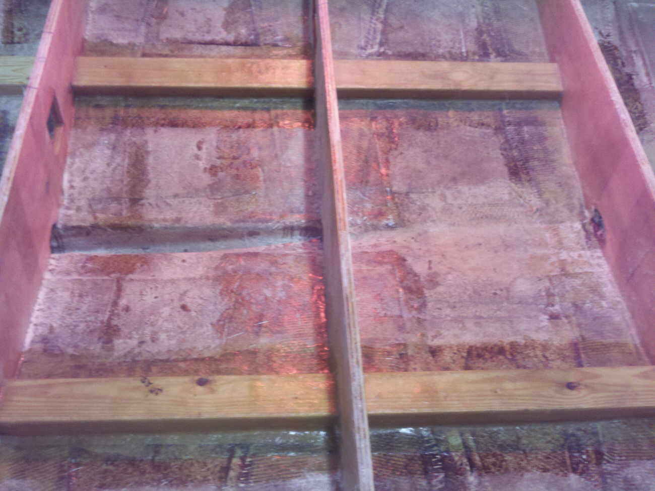 Note the cross stringer does not really do anything, it does not touch the sides of the boat nor it is secured to the floor. The 2x4's that the floor was attached to are rotted away, the glass is minimal and was not attached to the floor or the side of the boat. Everything just floats in thin sheets of glass at the most. |