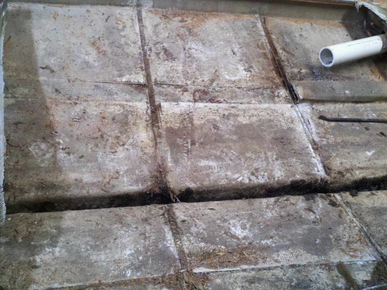 First view of under the floor was shocking. Notice the stringers that run bow to stern and encased in fiberglass look crooked, you will see why later. |