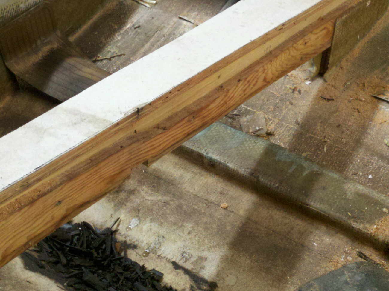 Here is the stringer that runs over the fuel tank with the 2x4 on the camera side removed. Notice the pile of rotted wood in the keel, and this is under the tank, the rest of the boat had even more. |
