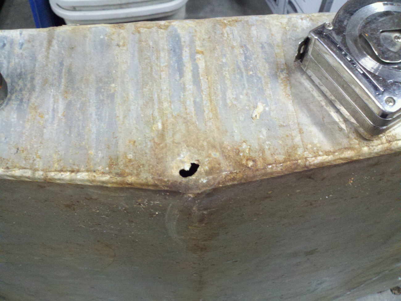 Here is the fuel tank after it was removed. It's a nice heavy 30 gallon tank, except for the dime size hole in the back bottom corner. The tank was sold for scrap aluminum, as the price to repair it was almost the same as a new 50 poly gallon tank. |