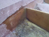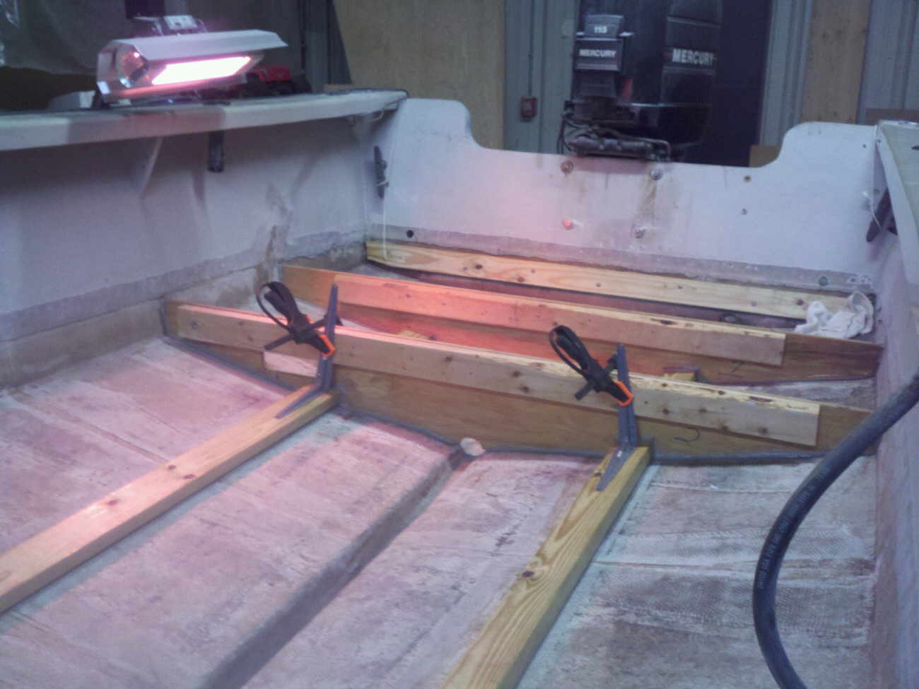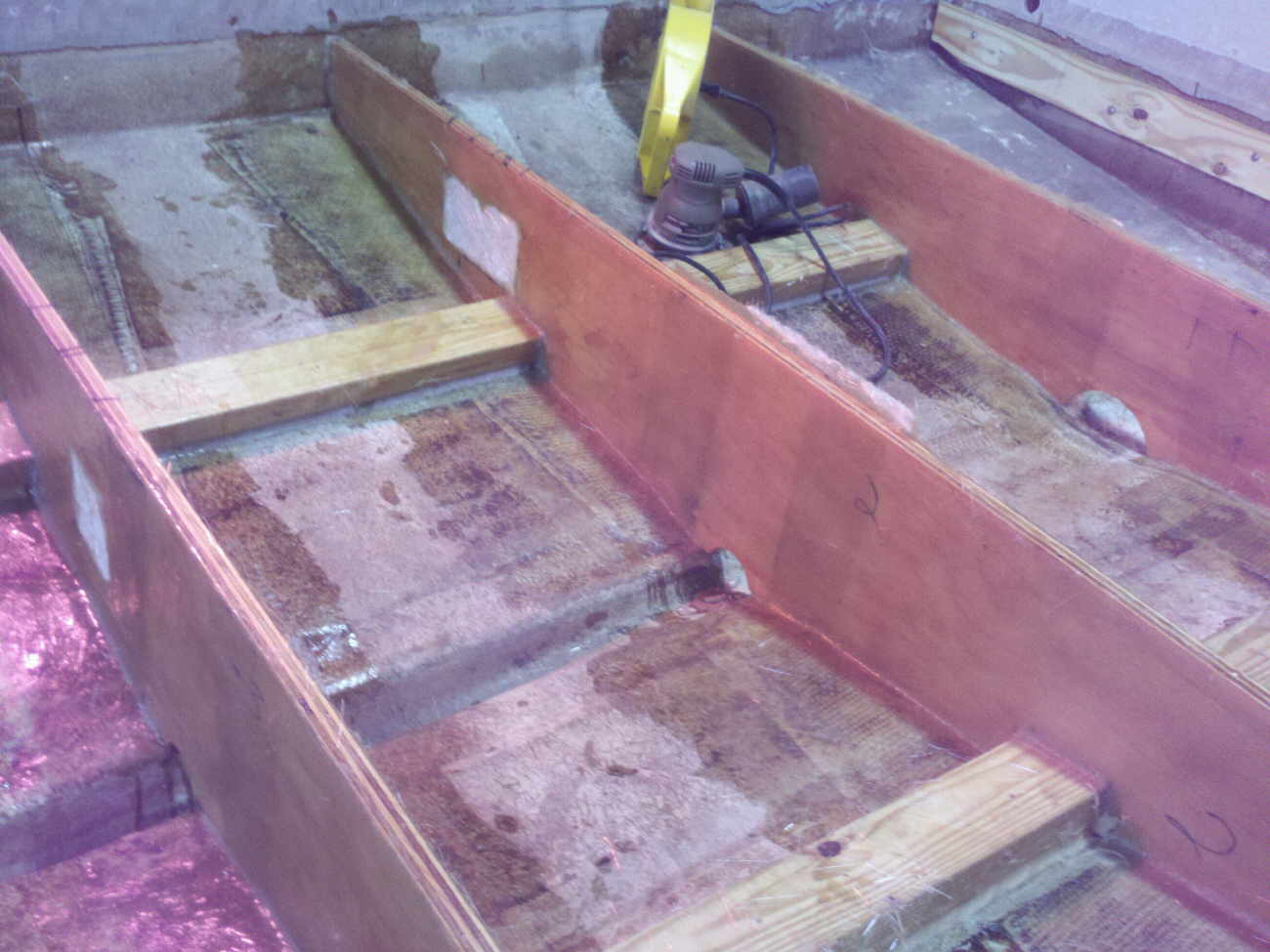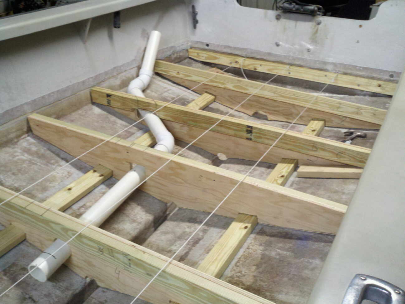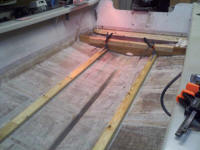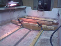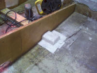 The 2X4's on the floor have been spit coated (50% resin 50% Acetone) and are peanut buttered to the floor, along with the first new stringer. The 2X4 on the stringer is there for support only and will be replaced with a new pressure treated one later down the line. |