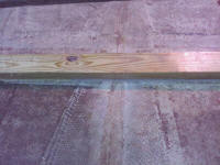 Here is the reason the bow to aft stringers look cooked, they are just scrap pieces of untreated 2x4's laid in for no real reason. Notice they are not attached to the plywood stringers, heck they are not even close to the stringers and one end is has a 45 degree cut, waste not want not. NOTE this is the same brace you see in the picture to the left after the glass was removed. |